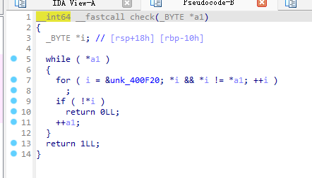if判断到\x00会停止,且\x00的字节也要符合unk_400F20数据中的值