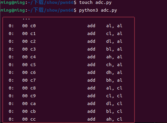 1 2 3 4 5 6 7 8 9 10 11 12 13 14 15 from pwn import *from itertools import *import refor i in range (1 ,3 ): for j in product([p8(k) for k in range (256 )],repeat=i): payload=b'\x00' +b"" .join(j) p=disasm(payload) if ( p !=" ..." and not re.search(r"\[\w*?\]" ,p) and ".byte" not in p): print (p)