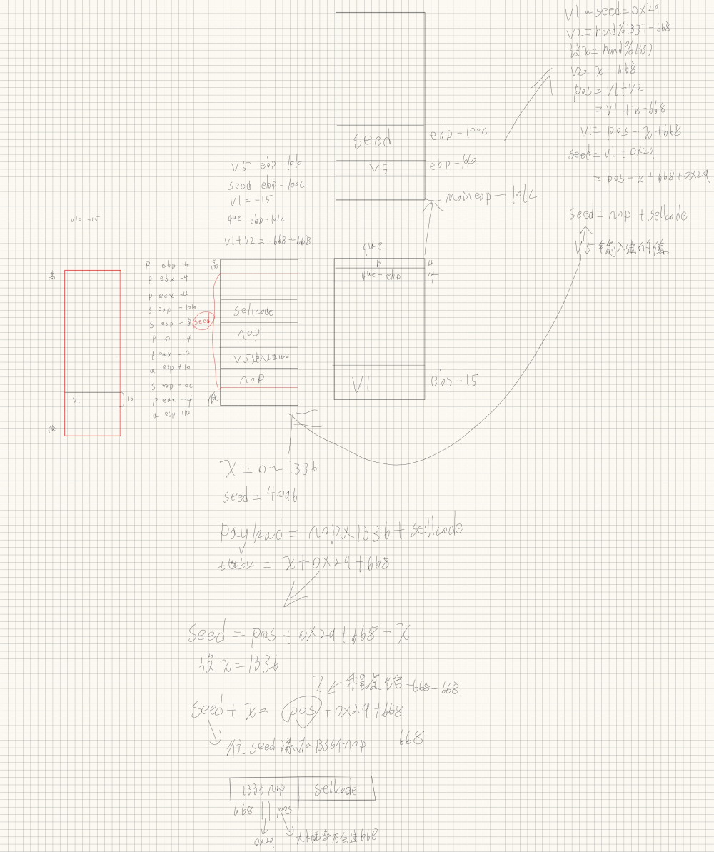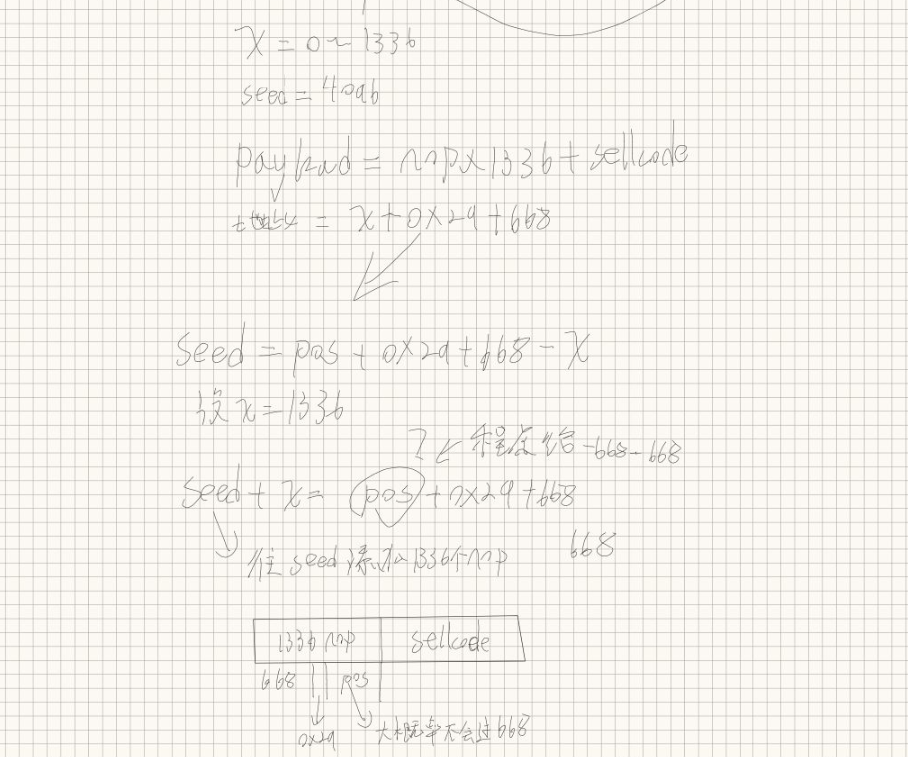 其中虽然payload=add+0x29+668并不是seed的准确地址位置,但是可以使用nop无操作符号填充进去,这样就算不是准确的地址也可以调用到nop操作符一直到shellcode的内容去执行