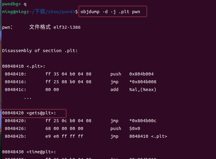 使用objdump -d -j .plt pwn命令可以查看到程序的函数plt地址