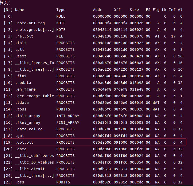 使用 readelf -S pwn可以查看所有节头信息,我们使用got表的起始地址