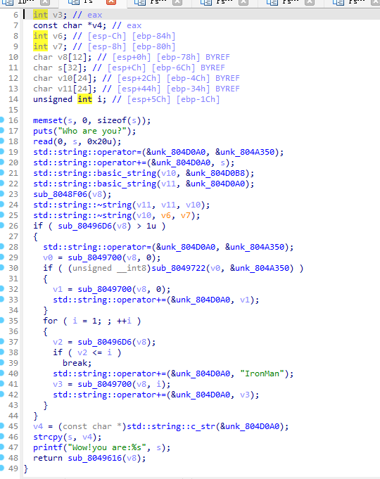 c++代码,具体意思是将I转换为IronMan再赋值个s,输入点只能输入0x20个大小