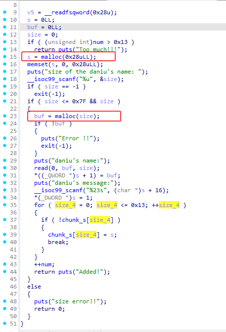 add 后会有一个固定的 0x28 大小的 chunk,和一个自行输入 size 大小的 chunk,size 被限制大小,add 的 chunk 数量也被限制为 0x13,并且 s->data 为 inuse