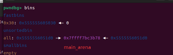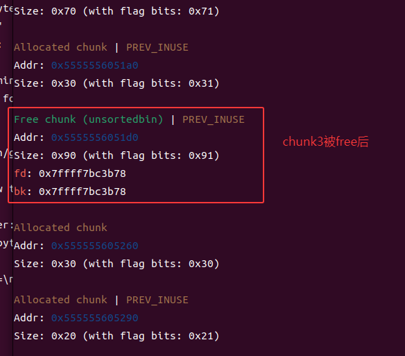 #3 申请释放后会进入unsortedbin 中使其 fd 为 main_arena+0x58