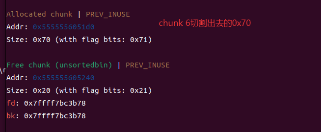 后续我们申请一个 size 为 0x68 大小的 chunk,此时我们的#0 chunk 就派上用场了,再进行 add 操作中程序会先申请一个 0x28 大小的 chunk(实际为 0x30),此时就会优先将 fastbin 中的 0x30 申请出去(原先#0 chunk 被 free 后存入),就不会和我们抢 #3 unsortedbin 中的
