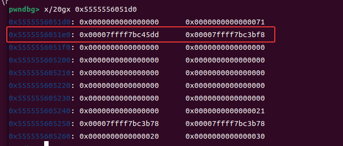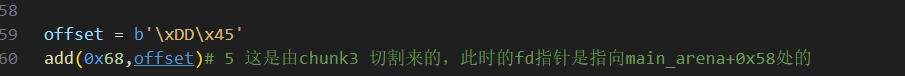 首先第一步我们需要将 chunk 放入unsortedbin 中,使其 fb 指针指向 main_arena+0x58,这边的值也是 libcbase+main_arena 基值+0x58,所以我们可以通过覆盖掉后四位使其到达 IO_2_1_stderr 中(后三位 0x5dd 是确定的,我们通过尝试得到第四位是 0x45dd),