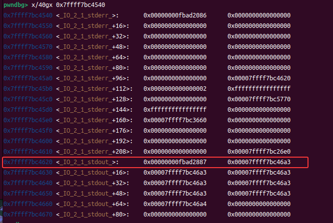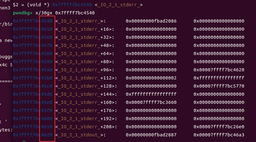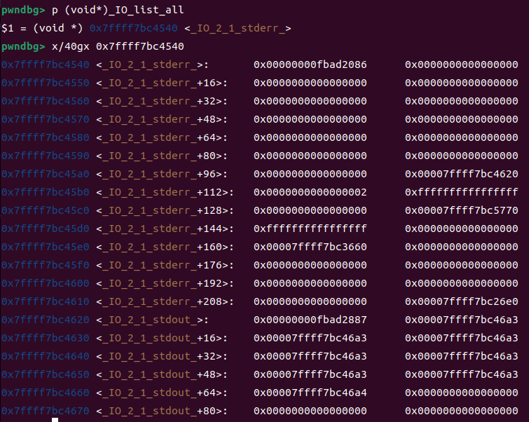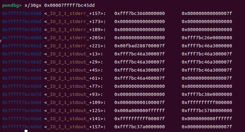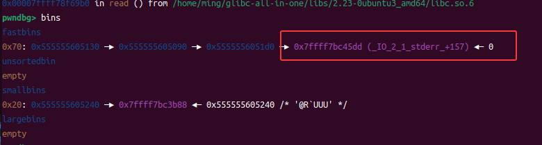 再将前面的 chunk 申请出来即可申请出以0x7ffff7bc45dd (IO_2_1_stderr+157)为地址的 chunk