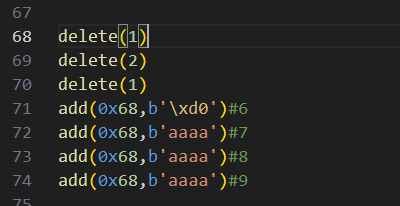 delete(1) delete(2) delete(1) add(0x68,p64(fake_chunk)) add(0x68,b'aaaa') add(0x68,b'aaaa')