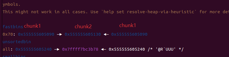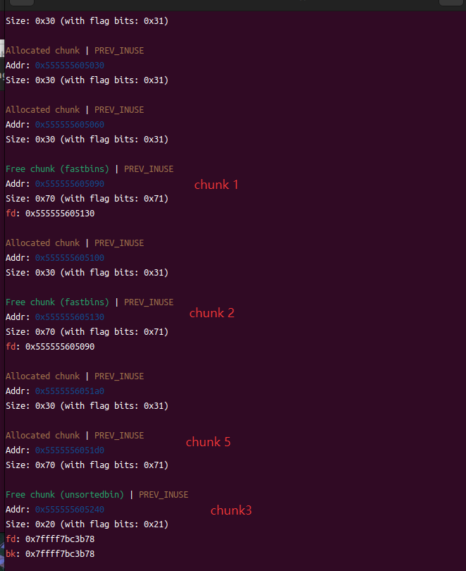 后续我们进行 double free,将 chunk5 的地址改到 chunk1 中