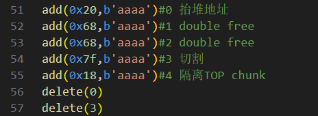 add(0x20,b'aaaa') add(0x68,b'aaaa') add(0x68,b'aaaa') add(0x7f,b'aaaa') add(0x18,b'aaaa') delete(0) delete(3)