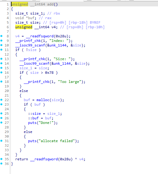 因为在 add 中对输入的 size 大小进行了限制,且一直只能对 index 为 0 的 chunk 进行操作