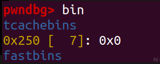 我们将tcache_addr 申请出来的tcache_perthread_struct 结构体将其 free 掉(本身也是一个 0x250 大小的 chunk)
